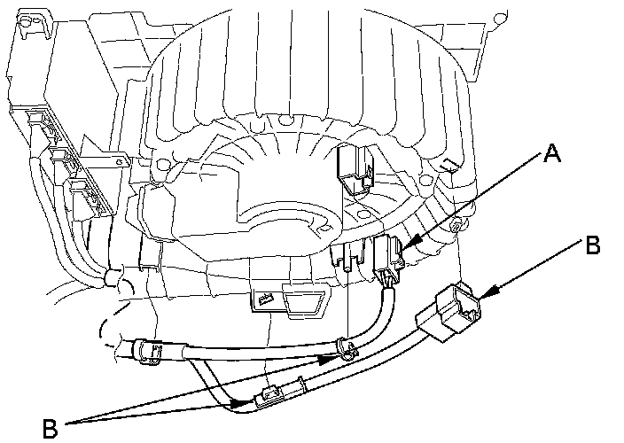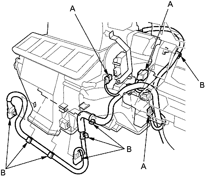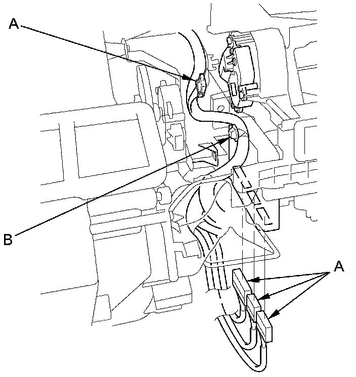 9. Disconnect the connector (A) from the blower motor. Remove the wire harness clips (B).
