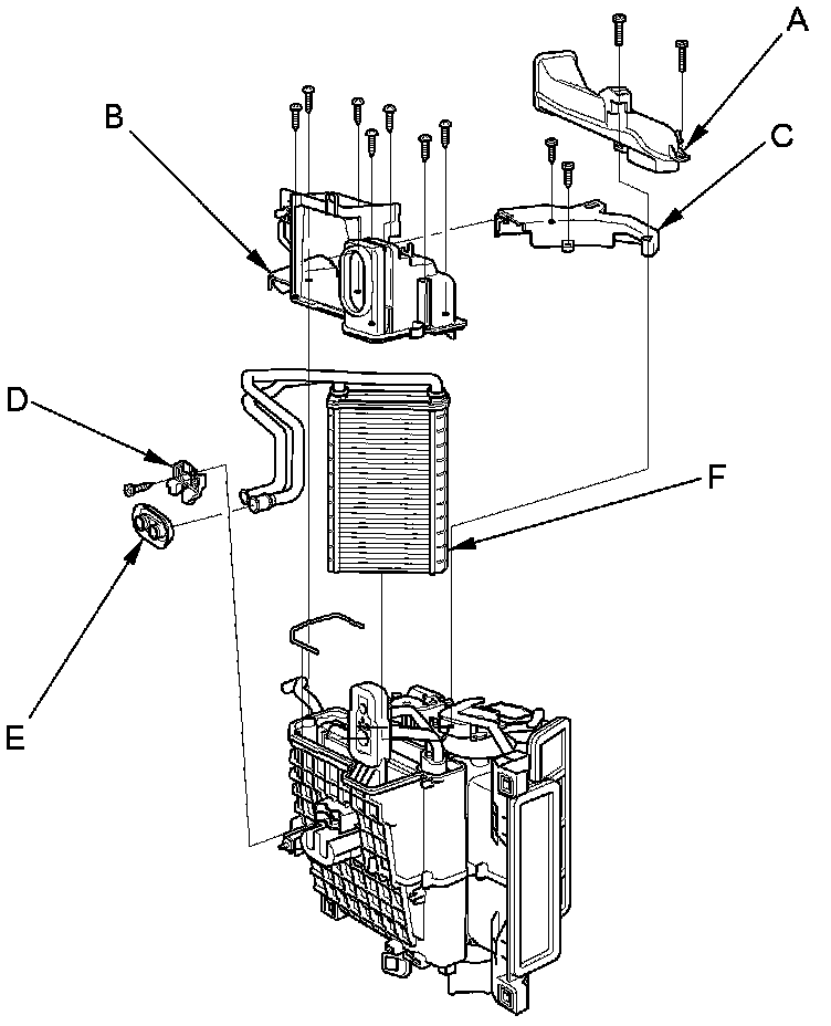 13. Remove the self-tapping screws and the passenger's heater duct (A). Remove the self-tapping screws and the joint duct (B). Remove the self-tapping screw and the heater core cover (C). Remove the self-tapping screw, the heater pipe bracket (D), and the grommet (E), and carefully pull out the heater core (F).