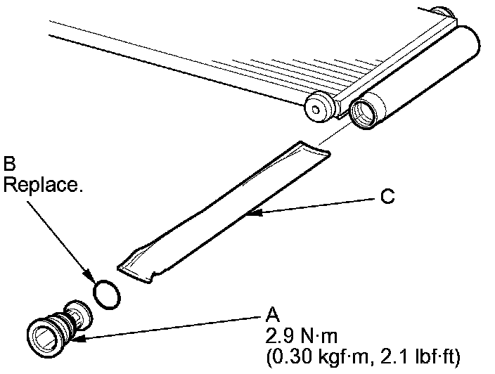 2. Remove the cap (A) from the bottom of the A/C condenser. Remove the O-ring (B) and the desiccant (C).