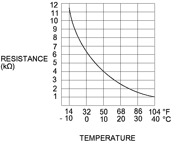 3. Compare the resistance reading between terminals No. 1 and No. 2 of the outside air temperature sensor with the specifications shown in the graph; the resistance should be within the specifications.