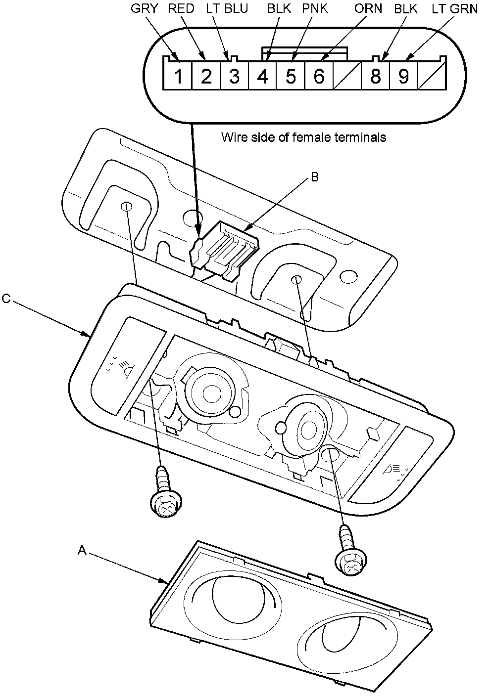 3. Disconnect the 10P connector (B) from the rear individual map light (C).
