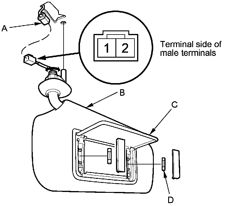 4. If the continuity is not as specified, check the bulbs (D). If the bulbs are OK, replace the sunvisor Service and Repair.