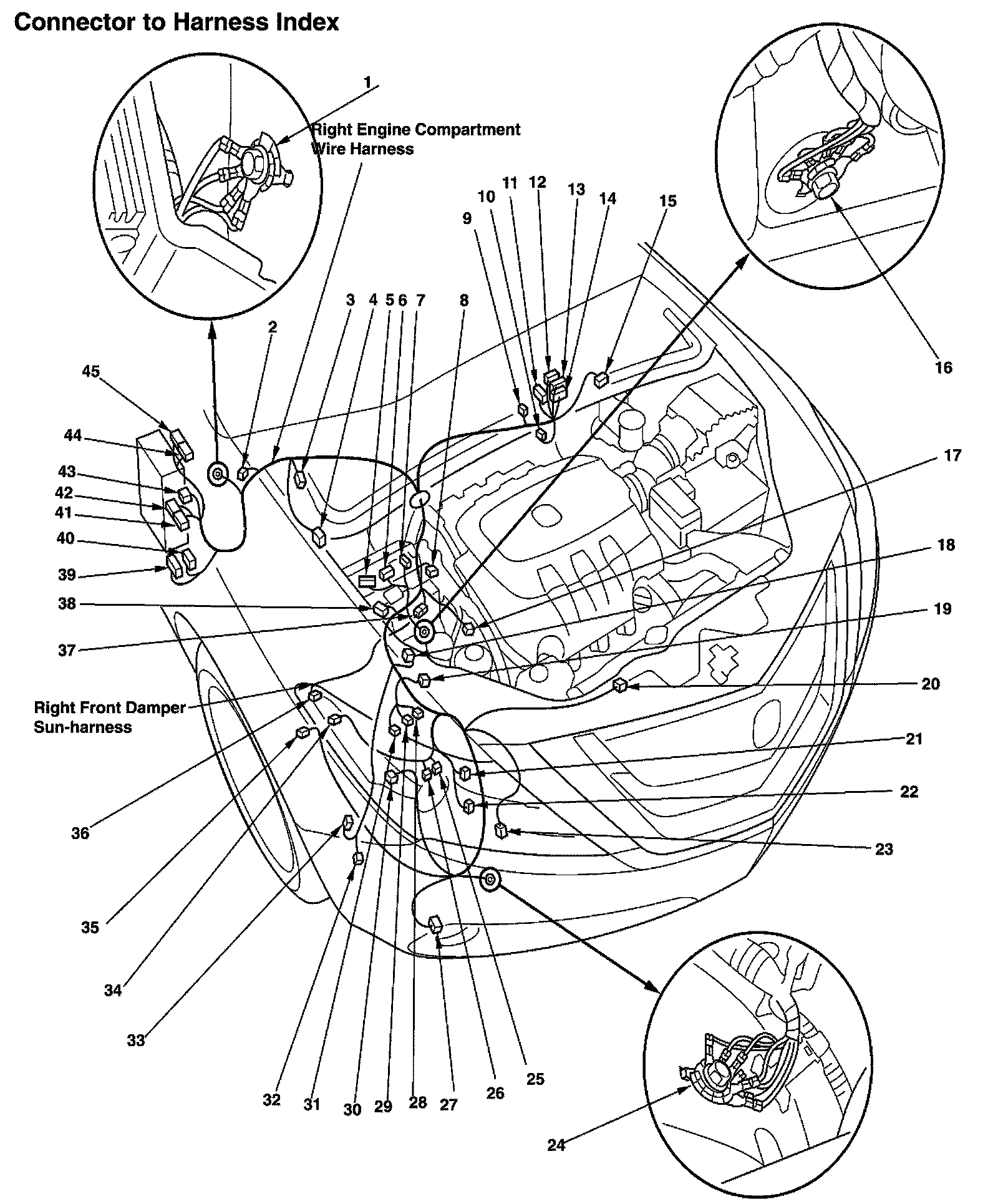 Right Engine Compartment Wire Harness, And Right Front Damper Sub-harness (IDS) Connector And Harness Locations