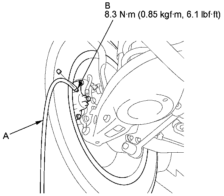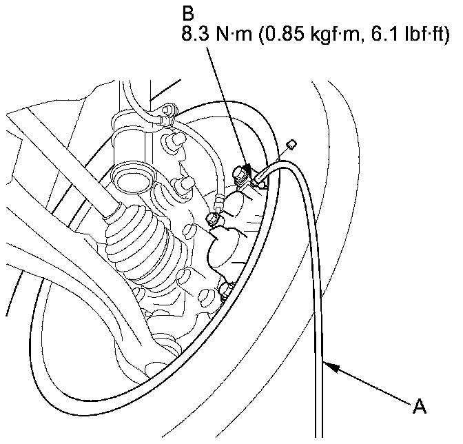 4. Attach a length of clear drain tube (A) to the bleed screw (B), then loosen the bleed screw to allow air to escape from the system. Then tighten the bleed screw securely.
