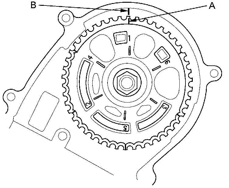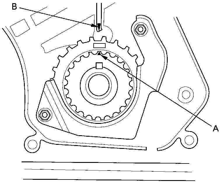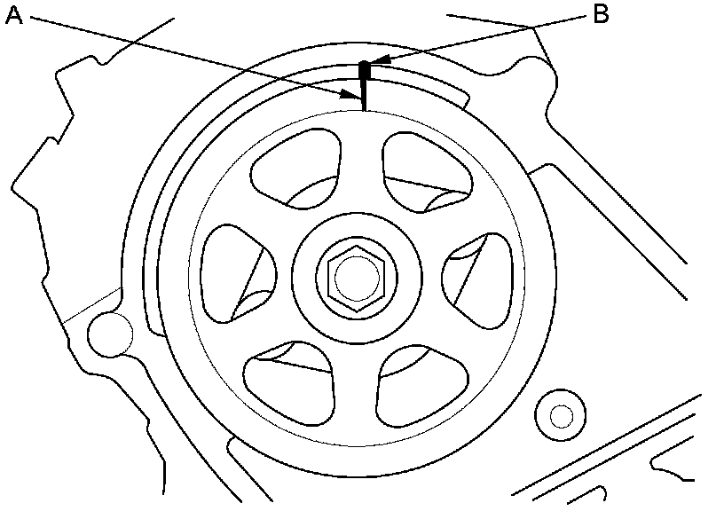 2. Set the timing belt drive pulley to top dead center (TDC) by aligning the TDC mark (A) on the tooth of the timing belt drive pulley with the pointer (B) on the oil pump.