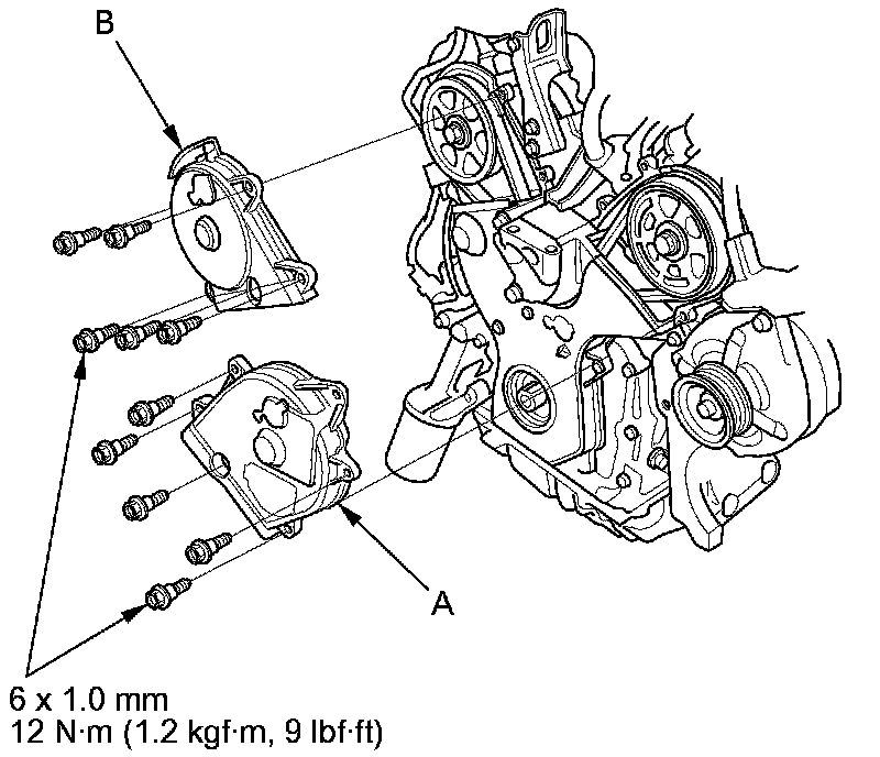 15. Turn the crankshaft pulley so its white mark (A) lines up with the pointer (B).