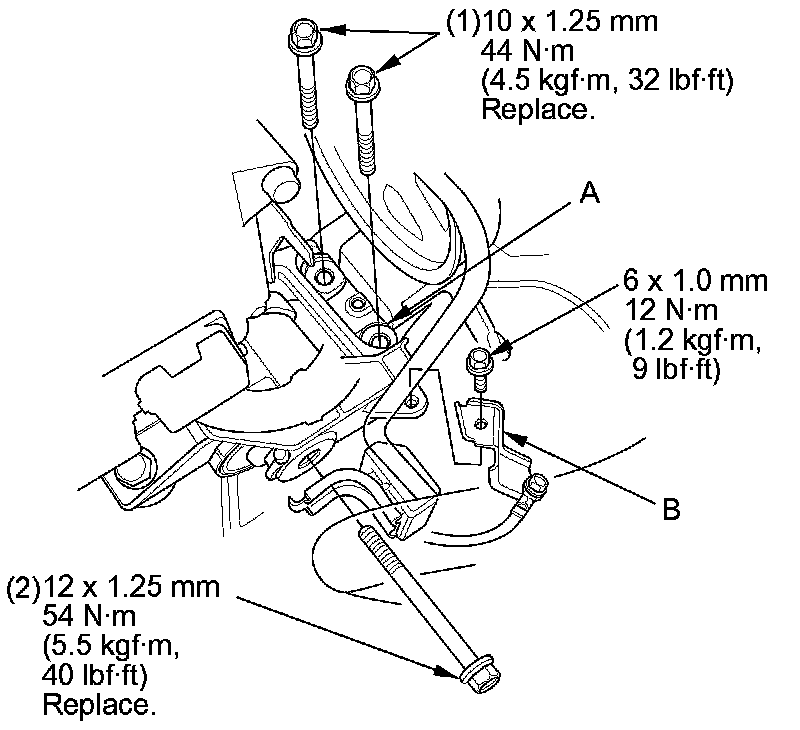 17. Loosely install the upper half of the side engine mount bracket (A), then install the ground cable bracket (B).