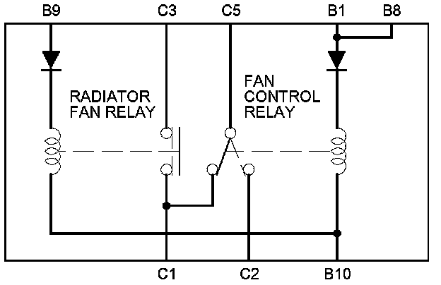 There should be continuity between terminals C2 and C5 when battery power is connected to terminal B1 (or B8), and body ground is connected to terminal B10. There should be no continuity between terminals C2 and C5 when power is disconnected.
