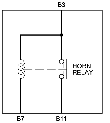 There should be battery voltage at terminal B11 when battery power is connected to terminal B3, and body ground is connected to terminal B7. There should be no voltage at terminal B11 when power is disconnected.