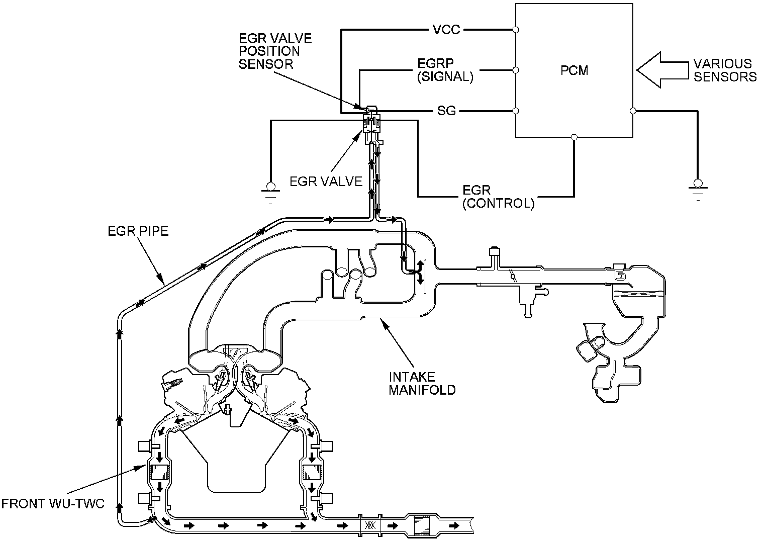 The EGR system reduces oxides of nitrogen (NOx) emissions by recirculating exhaust gas through the EGR pipe to the intake manifold, and into the combustion chambers. Routing the exhaust gas through the EGR pipe after the front WU-TWC helps to prevent carbon deposits from forming in the intake manifold and the throttle body. The PCM memory contains the ideal EGR valve position for varying operating conditions.