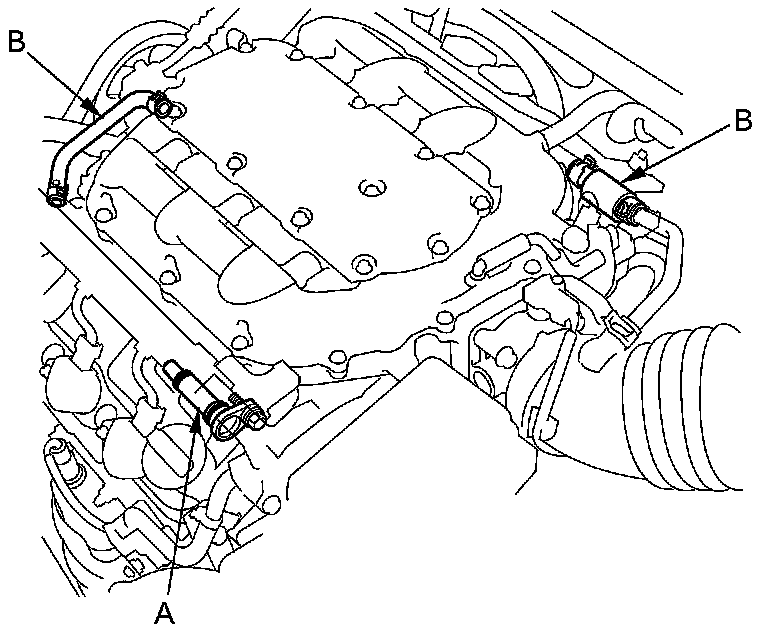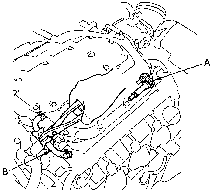 2. Check the PCV valve (A), the hoses (B), and the connections for leaks or restrictions.