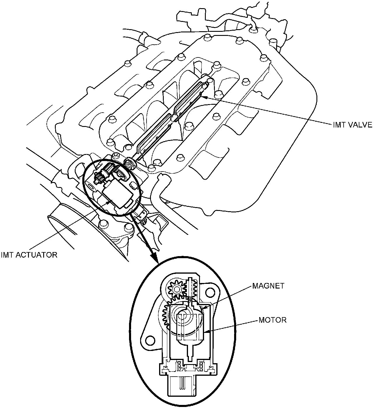The intake manifold tuning (IMT) actuator contains a sensor that detects the IMT valve position and sends it to the PCM.