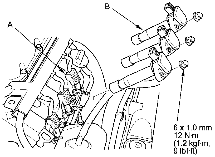2. Disconnect the ignition coil connectors (A), then remove the rear ignition coils (B).