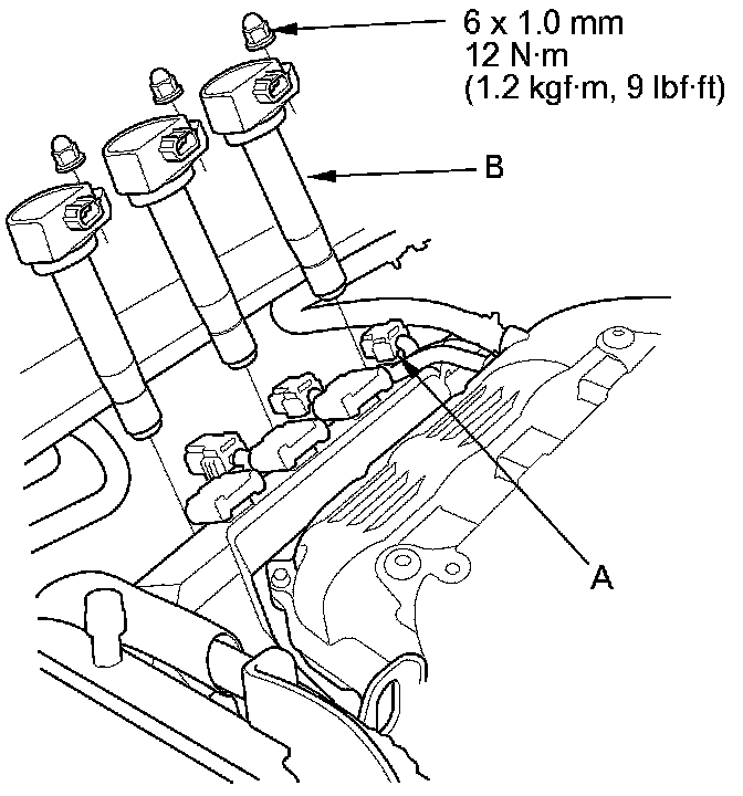 2. Disconnect the ignition coil connectors (A), then remove the front ignition coils (B).
