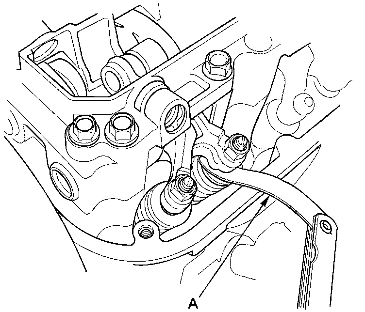 4. Insert the feeler gauge (A) between the adjusting screw and the end of the valve stem on the No. 1 cylinder, and slide it back and forth; you should feel a slight amount of drag.