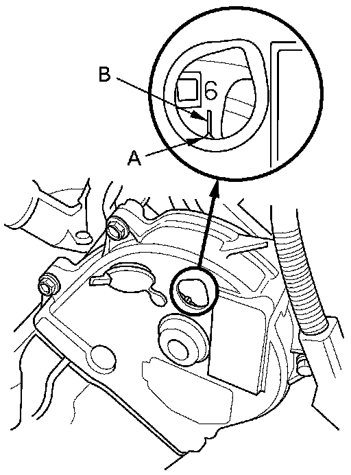 15. Rotate the crankshaft clockwise. Align the pointer (A) on the front upper cover with the No. 6 piston TDC mark (B) on the front camshaft pulley.