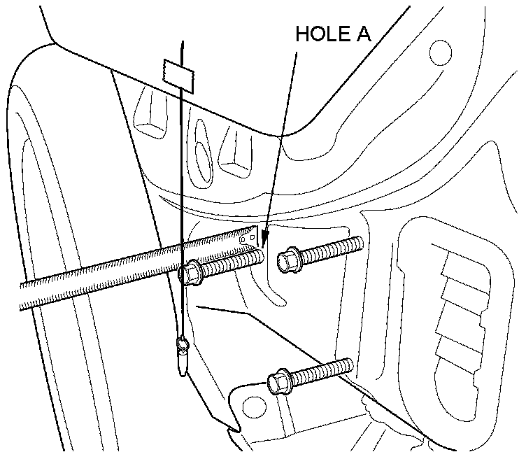 5. Hold or tape the plumb line against the rear quarter panel directly above mounting hole A, and thread bolt in or out until the head of the bolt just touches the plumb line.