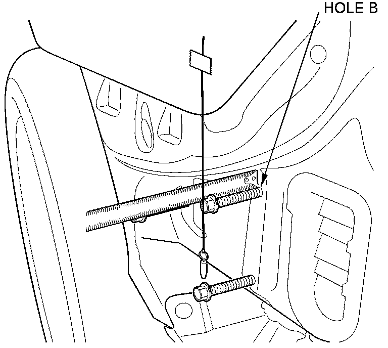 7. Hold or tape the plumb line against the rear quarter panel directly above mounting hole B, and thread bolt in or out until the head of the bolt just touches the plumb line.