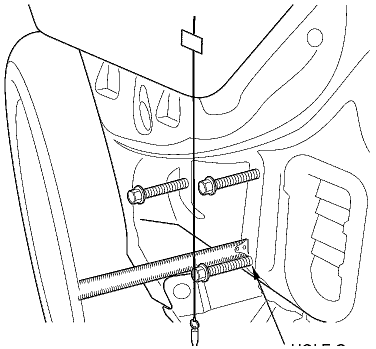9. Hold or tape the plumb line against the rear quarter panel directly above mounting hole C, and thread bolt in or out until the head of the bolt just touches the plumb line.