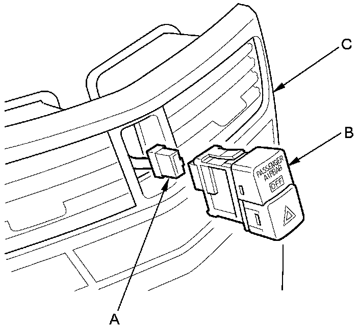 4. Push out the hazard warning switch/passenger's airbag cutoff indicator (B) from behind the switch panel (C).