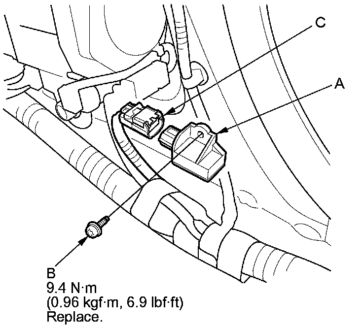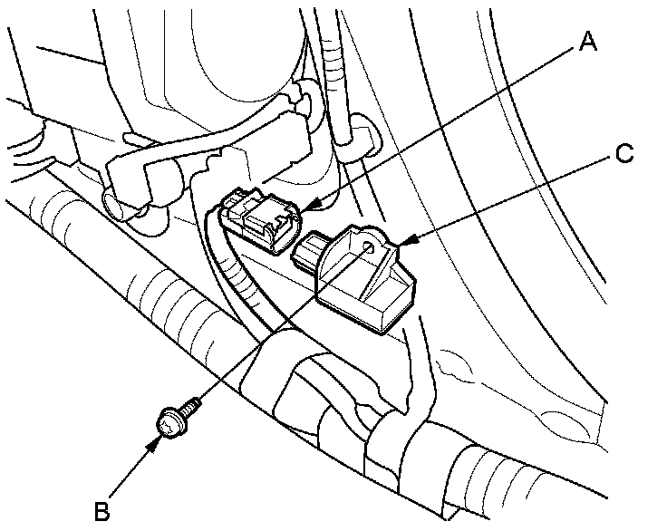 1. Install the side impact sensor (first) (A) with a new TORX bolt (B) using a TORX T30 bit. Connect the side impact sensor (first) 4P connector (C) on the floor wire harness.