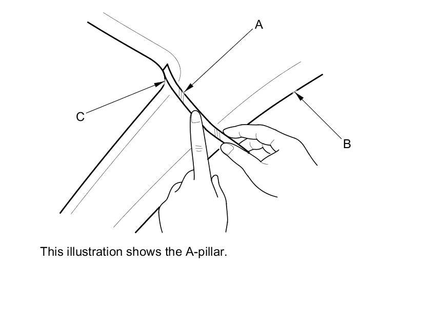2. Apply masking tape (A) to the headliner (B) to mark the upper edge of the pillar trim (C).