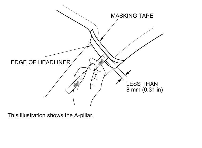 To prevent the side curtain airbag from deploying and damaging the pillar trim (A-pillar trim, B-pillar trim, quarter pillar trim), the overlap between the headliner and pillar trim must be less than 8 mm(0.31 in). To check the overlap, do this: