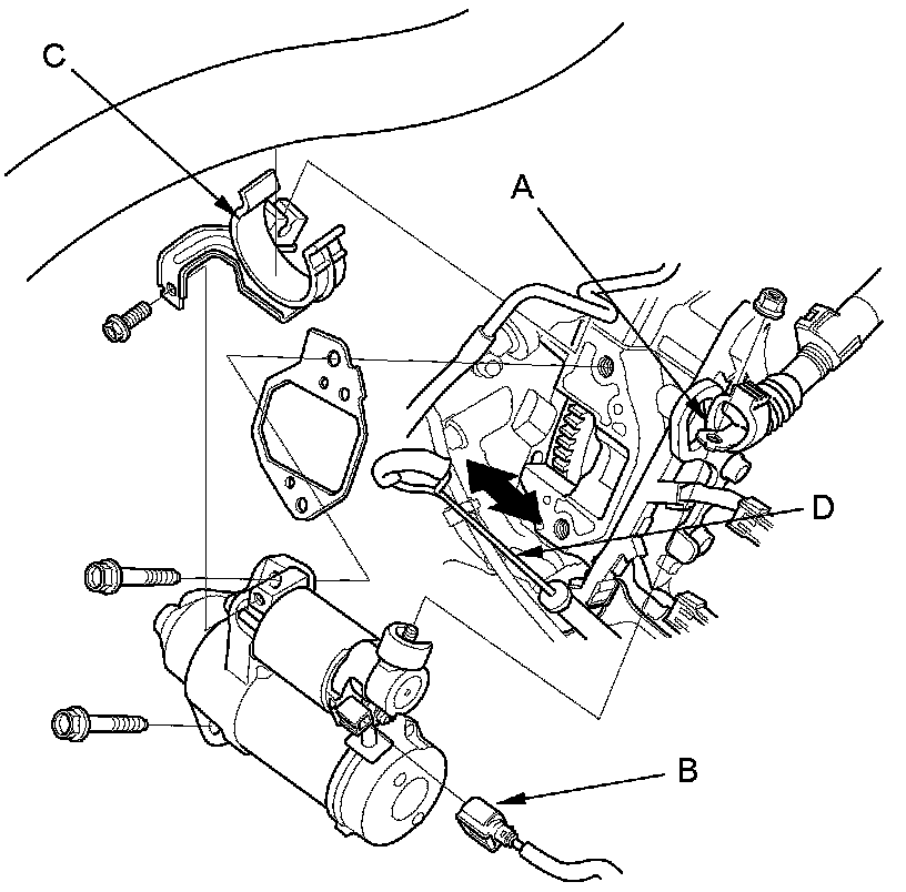 4. Remove the lower radiator hose bracket (C) from the starter and remove the dipstick (D).