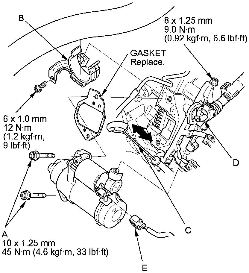 3. Connect the positive starter cable (D) and the S terminal connector (E). Make sure the crimped side of the ring terminal faces away from the starter when you connect it.