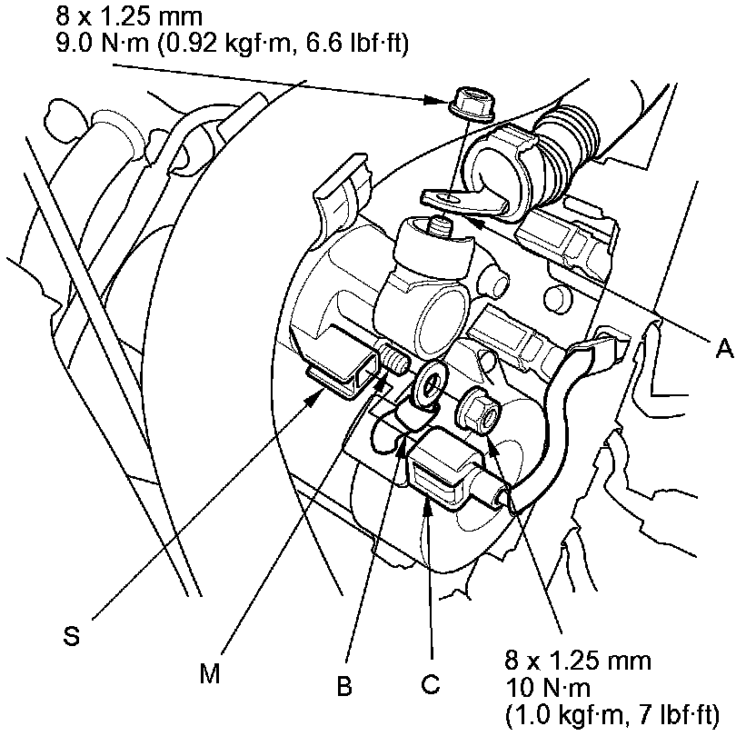 3. Disconnect the positive starter cable (A), the motor wire (B), and the S terminal connector (C).