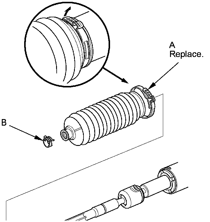 5. Remove the boot bands (A) and tie-rod clips (B). Pull the boot away from the ends of the steering gearbox.
