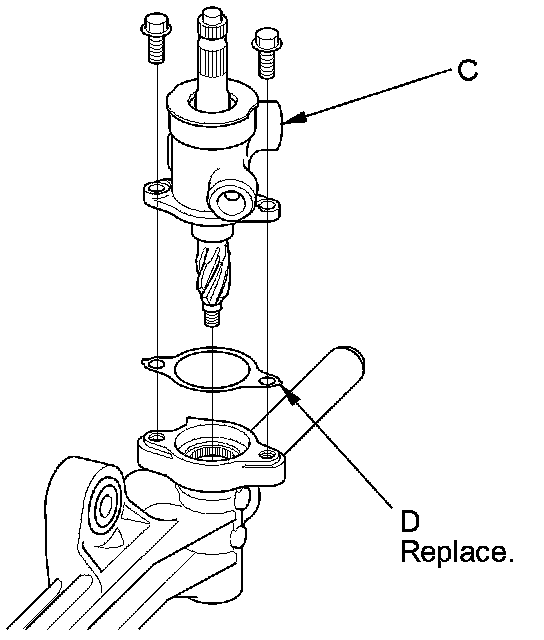 16. Remove the two flange bolts, the valve body unit (C), and gasket (D) from the gearbox housing. Check that the valve turns smoothly by turning the pinion shaft. If any play or roughness is felt, replace the valve body unit with a new part.