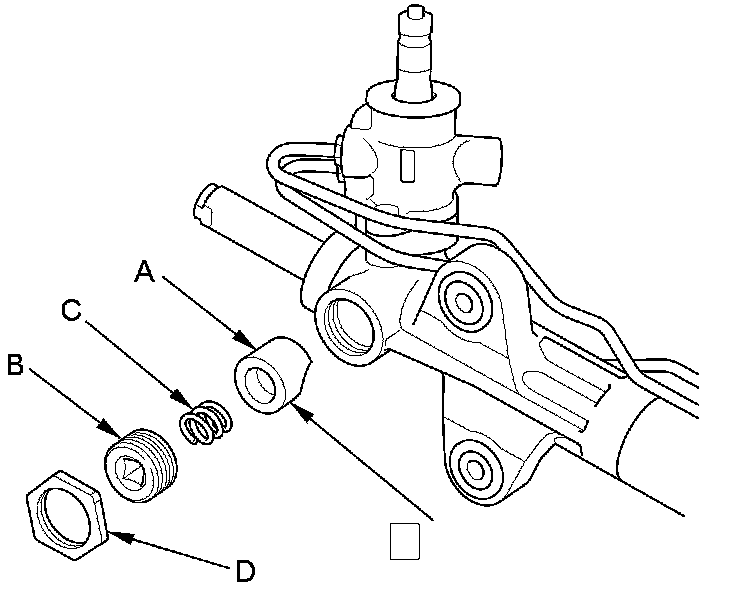 55. Remove the old sealant from the rack guide screw (B), and apply new sealant (Loctite 565) to the middle of the threads of the rack guide screw, then install the spring (C), rack guide screw, and locknut (D).