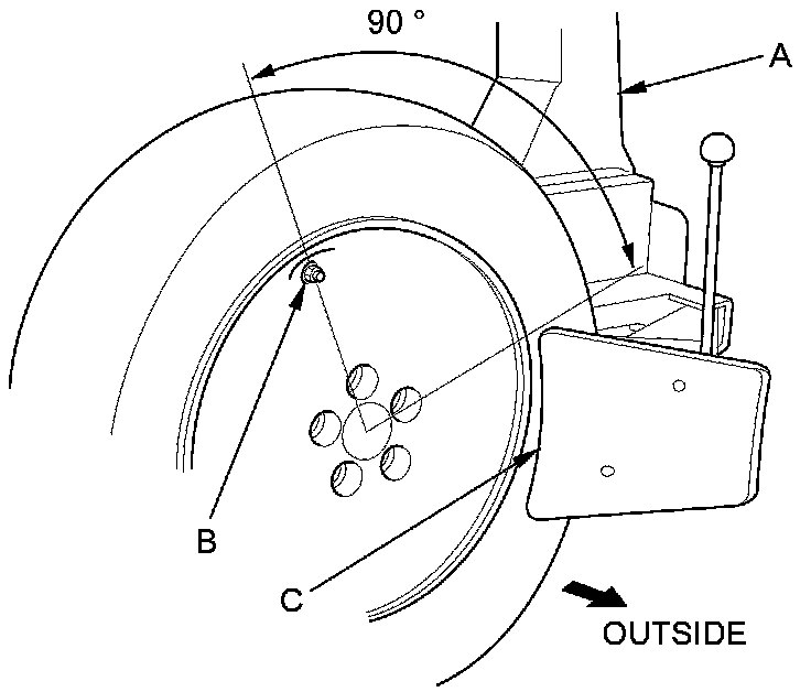- Position the wheel as shown so the valve stem (B) is 90 degrees from the bead breaker (C) as shown.