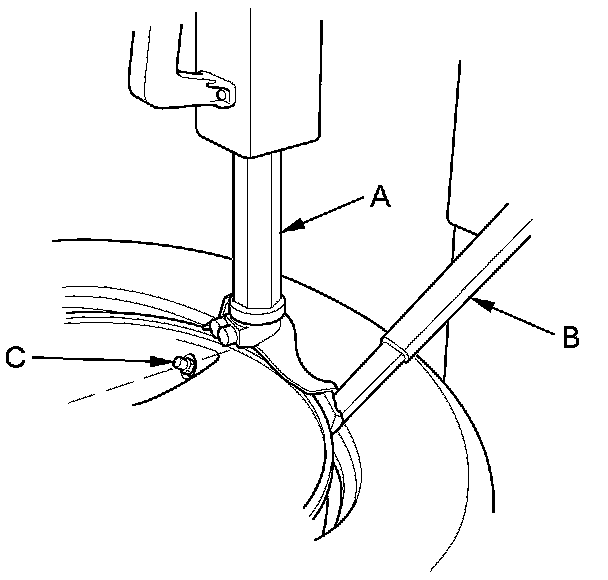 5. Position the wheel so that the tire machine (A) and the tire iron (B) are next to the valve stem (C), and will move away from it when the machine starts. Then remove the tire from the wheel.