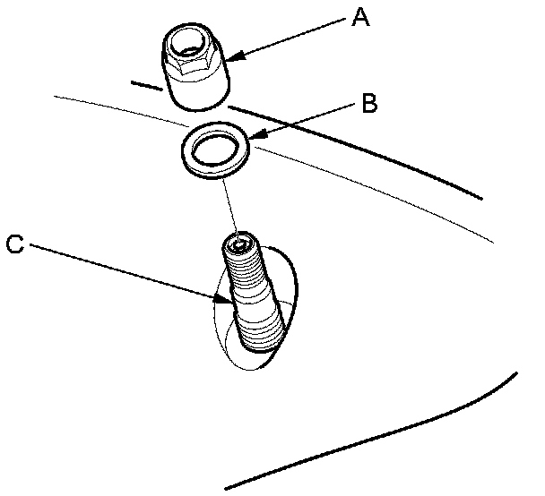 6. Remove the valve stem nut (A) and the washer (B), then remove the tire pressure sensor with the valve stem (C) from the wheel.