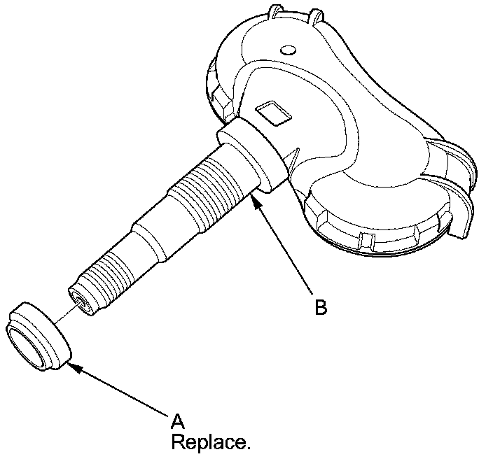 7. Remove and replace the valve stem grommet (A) from the tire pressure sensor (B).