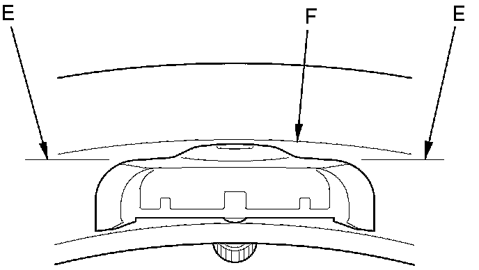NOTE: Install the tire pressure sensor so that the sensor housing surface (E) should not exceed the protrusion (F) of the wheel to prevent the sensor housing from being caught on the bead of the tire when assembling the tire. Be sure to always mount the tire pressure sensor with the feet (G) in the downward position toward the wheel.