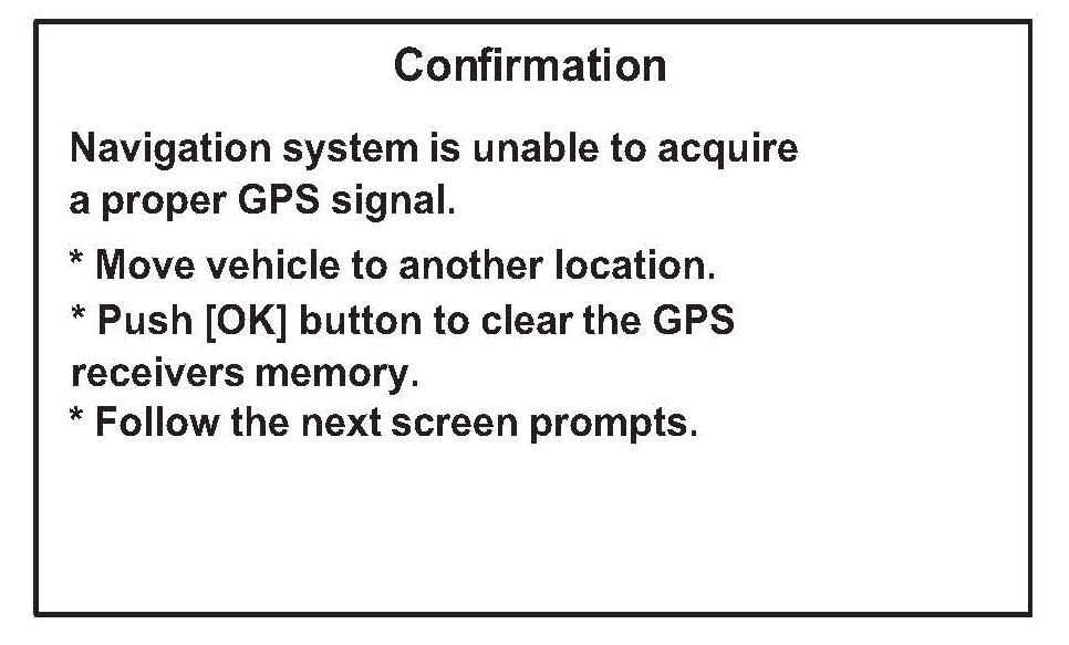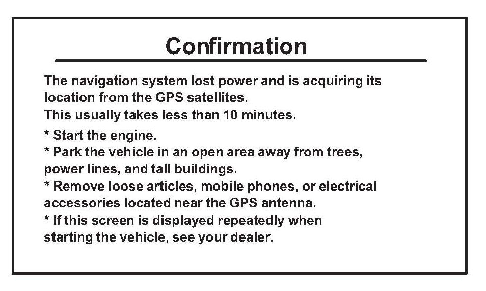 ^ Park the vehicle outside with an unobstructed view of the sky, and leave the engine running. The system searches for available GPS satellites, and gets their orbital signal information.