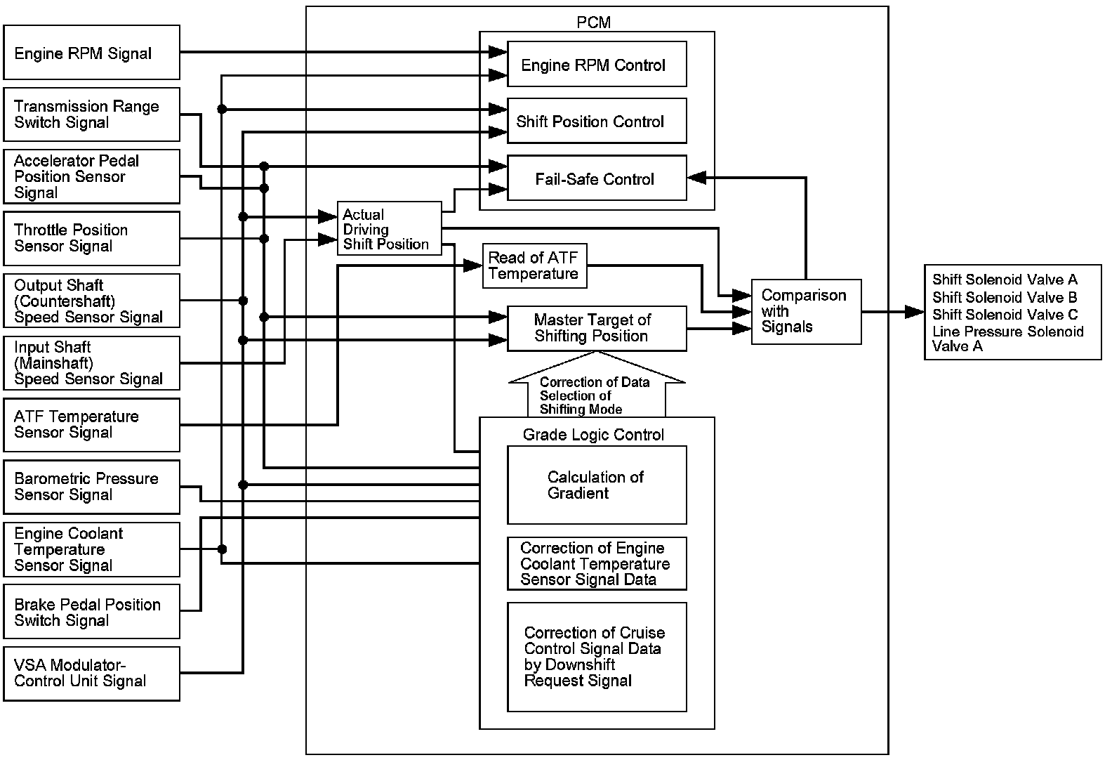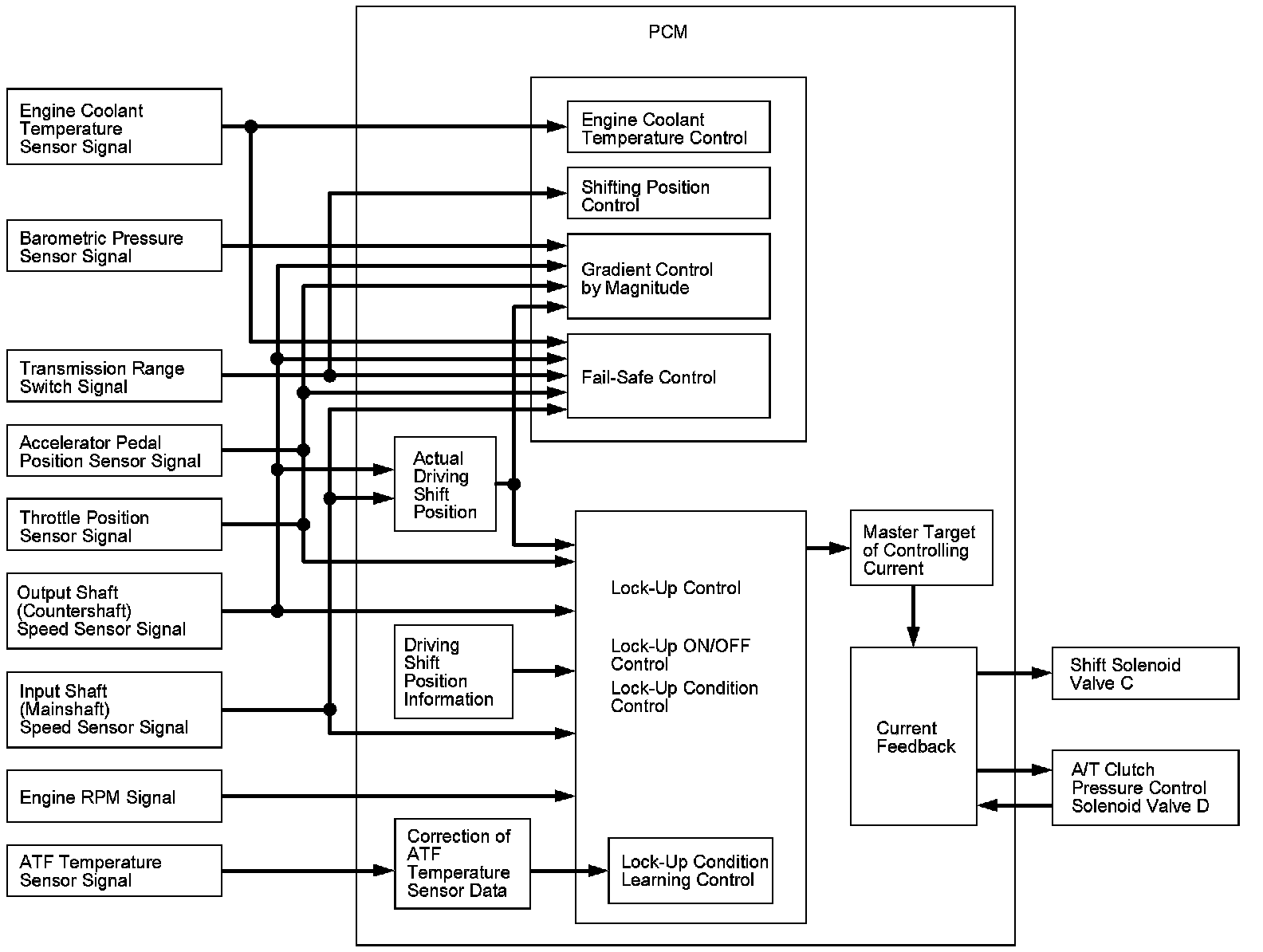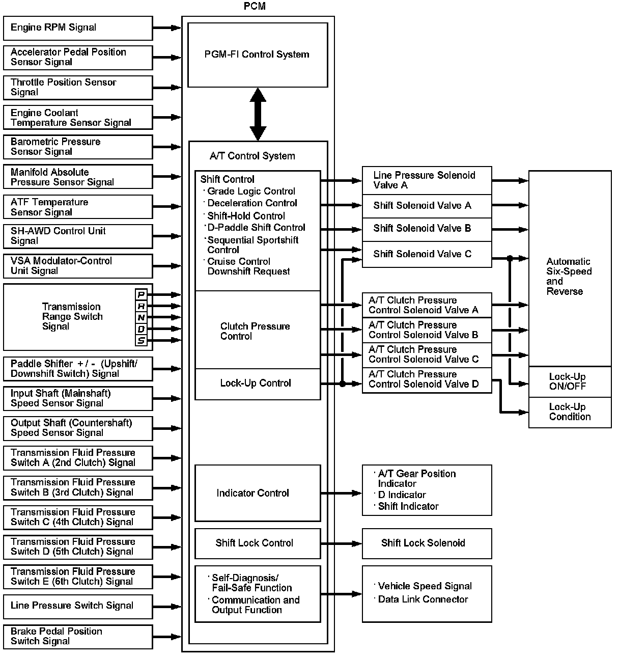 The PCM receives input signals from the sensors, switches and other control units, processes data, and outputs signals for the engine control system and the A/T control system. The A/T control system includes shift control, clutch pressure control, lock-up control, and A/T system hydraulic control. The PCM switches the shift solenoid valves and the A/T clutch pressure control solenoid valves on and off in a specific sequence to control gear selection and torque converter clutch lock-up. It also controls the appropriate operating hydraulic pressure to the automatic transmission.