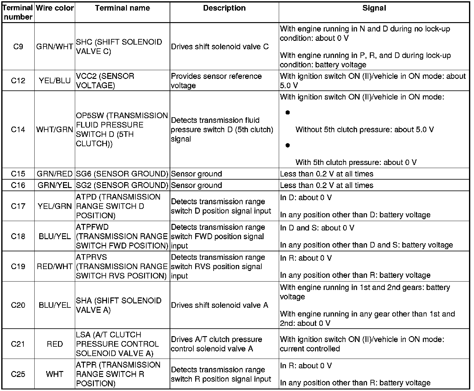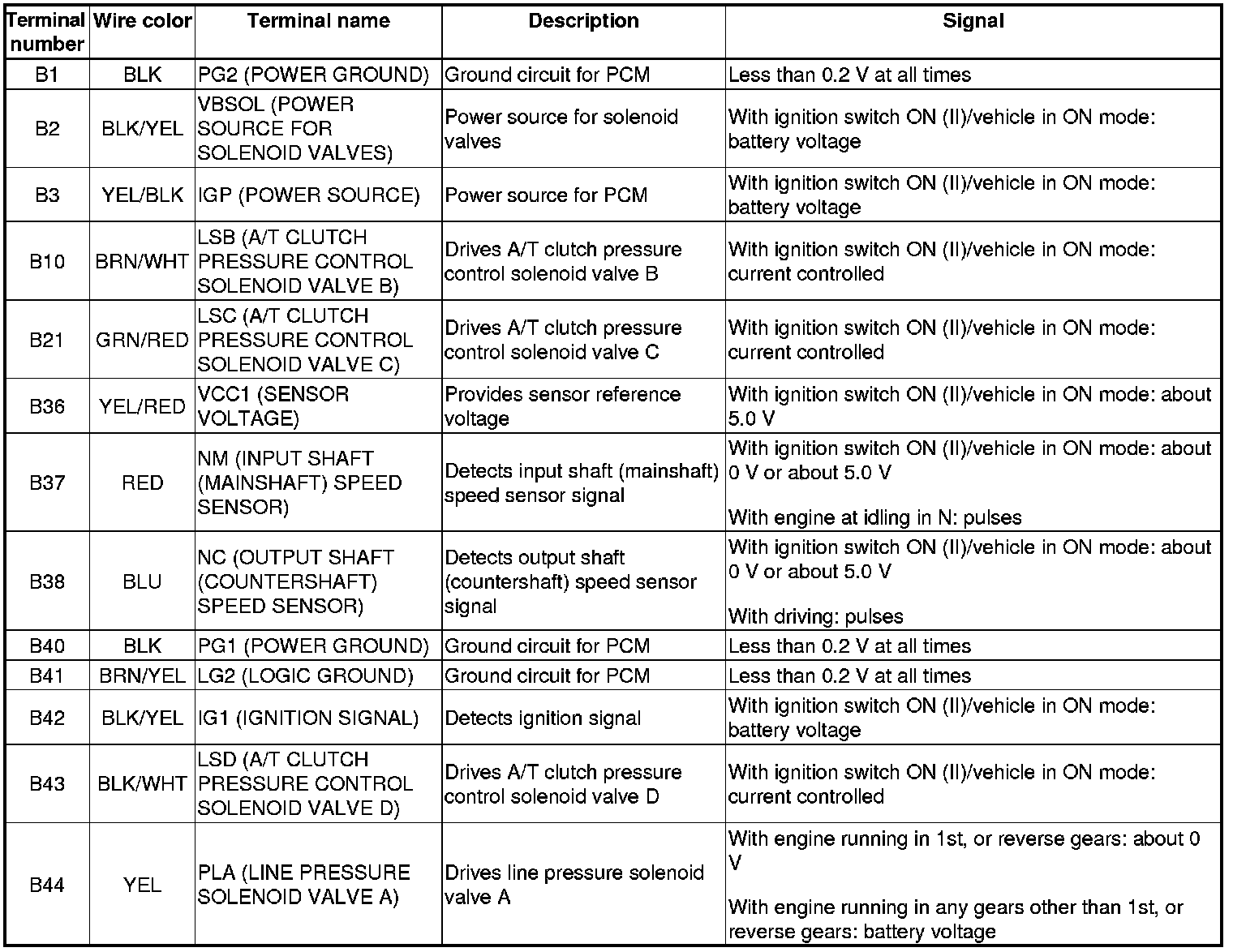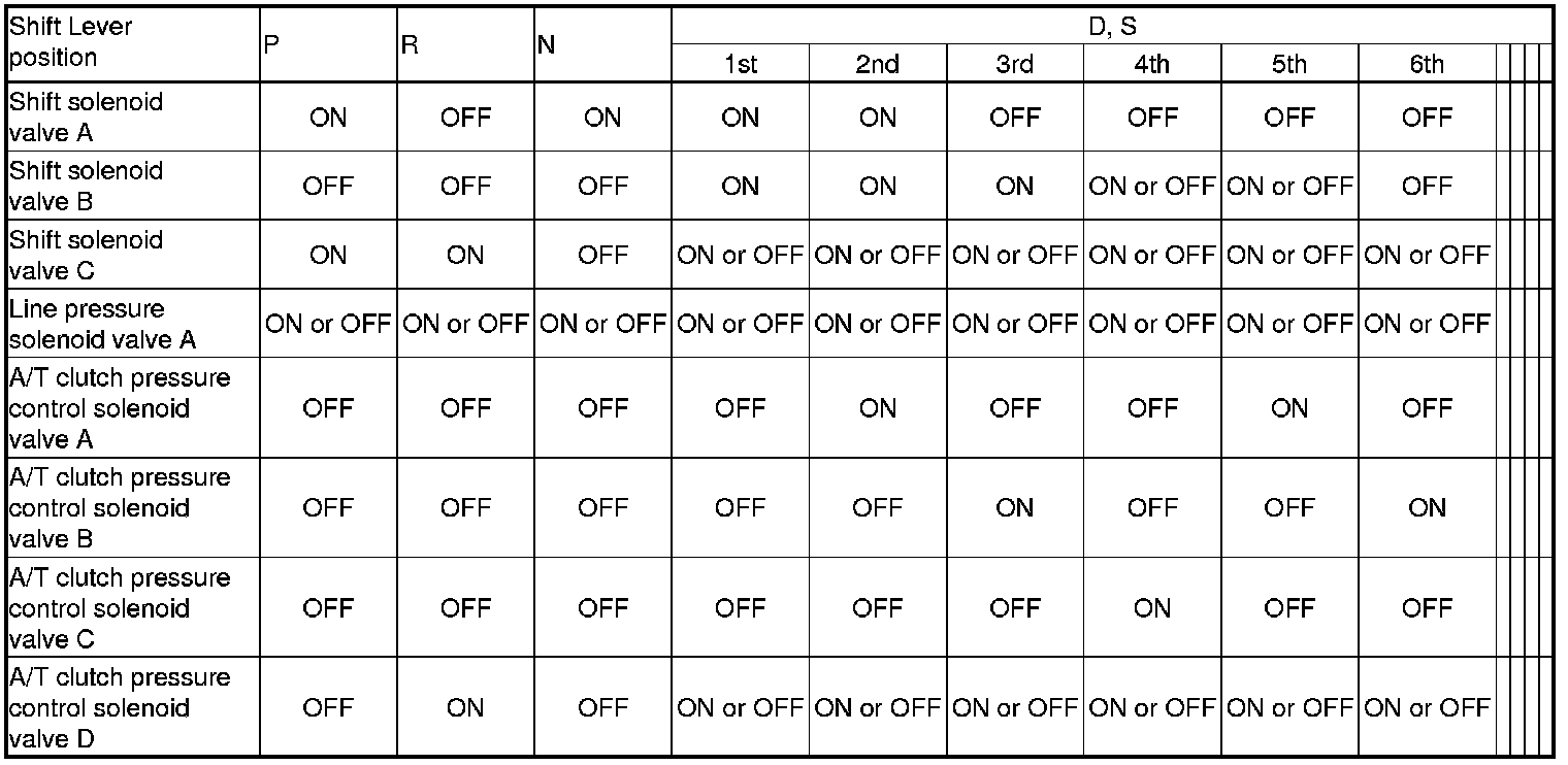The combination of driving signals to solenoid valves for each gear are in the following table.