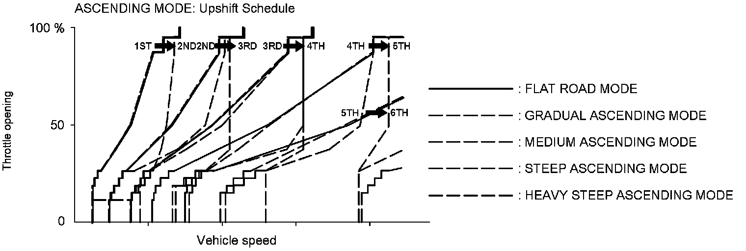 NOTE: Shift commands stored in the PCM between 2nd and 3rd gears, between 3rd and 4th gears, between 4th and 5th gears, and between 5th and 6th gears, enable the PCM to automatically select the most suitable gear based on the steepness of the grade.