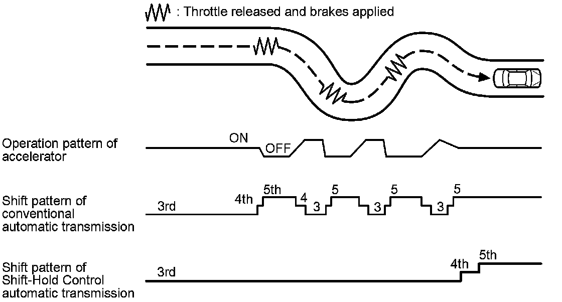 When the PCM determines that the vehicle is going down a hill in D, and in S with automatic shift mode, the upshift speed from 5th to 6th gear, 4th to 5th gear, 3rd to 4th gear, and from 2nd to 3rd (when the throttle is closed) becomes higher than the set speed for flat road driving to extend the 5th gear, 4th gear, 3rd gear, and 2nd gear driving areas. This, in combination with engine braking from the deceleration lock-up, achieves smooth driving when the vehicle is descending. There are descending modes with different 5th gear, 4th gear, 3rd gear, and 2nd gear driving areas based on the steepness of the grade stored in the PCM. When the vehicle is in 6th, 5th, or 4th gear, and the vehicle is decelerating while applying the brakes on a steep hill, the transmission downshifts to a lower gear. When you accelerate, the transmission then returns to a higher gear from the current position.