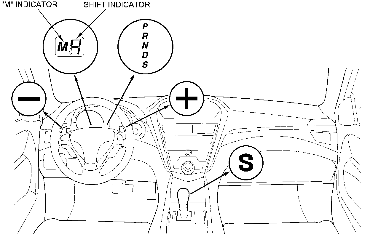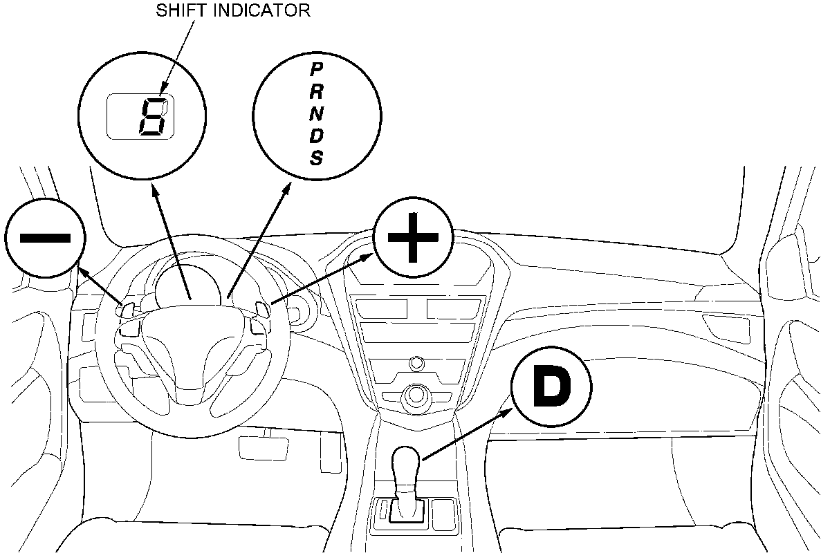 The S position has two shifting modes; the automatic shift mode and the sequential sportshift mode. In the S position automatic shift mode, the transmission upshifts and downshifts automatically from 1st through 5th gear, if the paddle shifters are not pressed. When the paddle shifter + (upshift switch) or the paddle shifter - (downshift switch) is pressed, the automatic shift mode is canceled and the sequential sportshift mode comes into operation. The shift indicator displays the number of the selected gear. In the sequential sportshift mode, the driver can shift up and down manually from 1st through 6th gear by using the paddle shifters, much like a manual transmission. The paddle shifters are installed on the back of the steering wheel, and the driver can shift gears by pressing the paddle shifters without taking either hand off the steering wheel. In the sequential sportshift mode, the transmission must be shifted up and down by pressing the paddle shifters.
