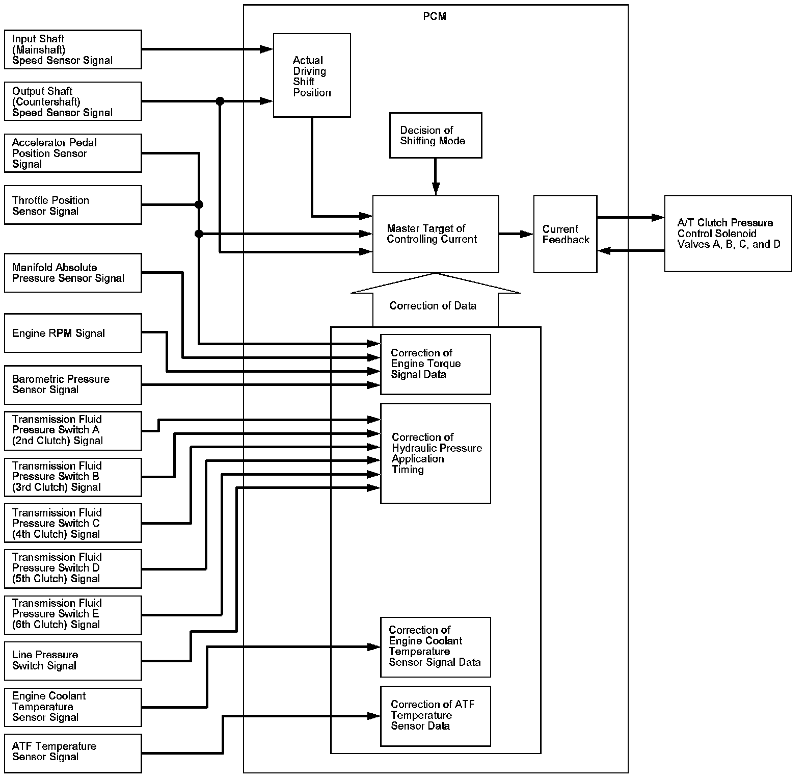 The PCM actuates A/T clutch pressure control solenoid valves A, B, C, and D to control the clutch pressure. When shifting between gears or during lock-up, the clutch pressure regulated by A/T clutch pressure control solenoid valves A, B, C, and D engages and disengages the clutch smoothly. The PCM receives input signals from the various sensors and switches, then processes the data, and outputs current to A/T clutch pressure control solenoid valves A, B, C, and D.