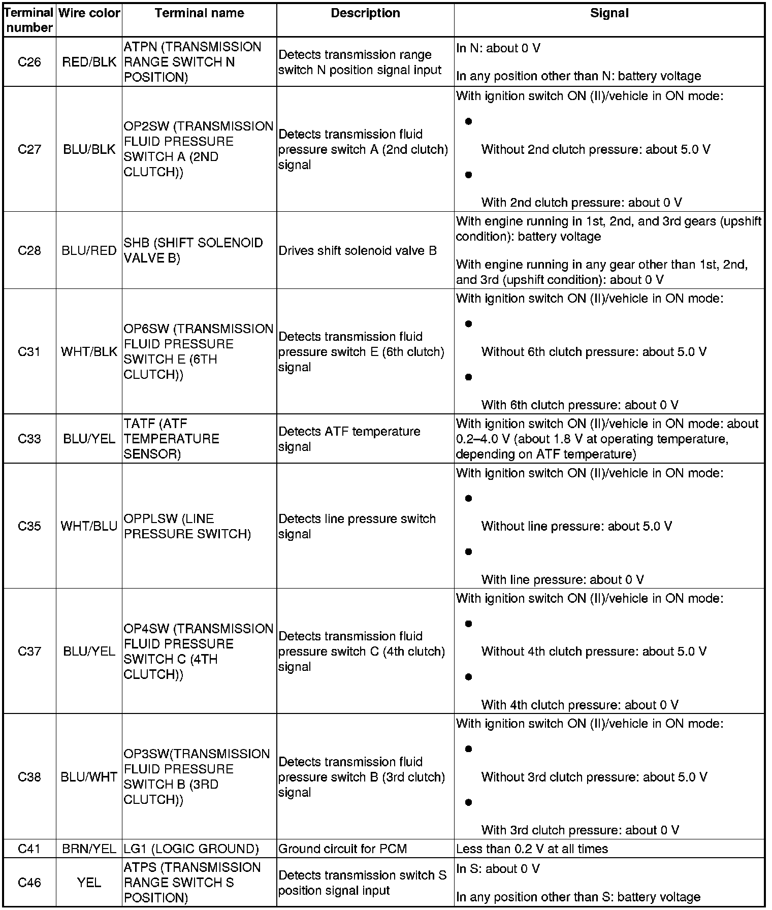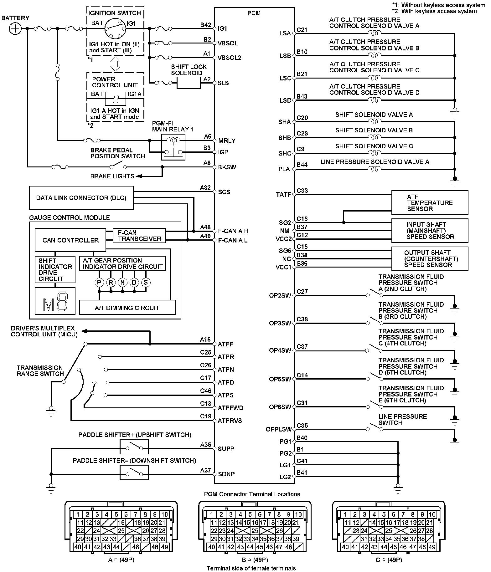 PCM A/T Control System Inputs and Outputs at PCM connector C (Circle) (49P)