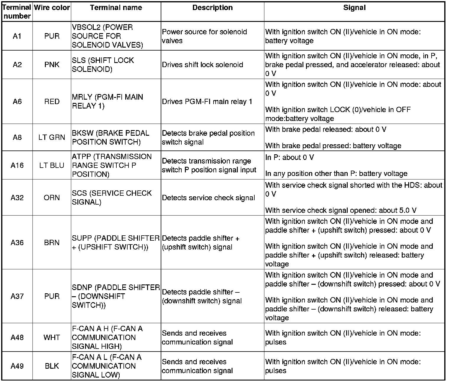 PCM A/T Control System Inputs and Outputs at PCM connector A (Square) (49P)