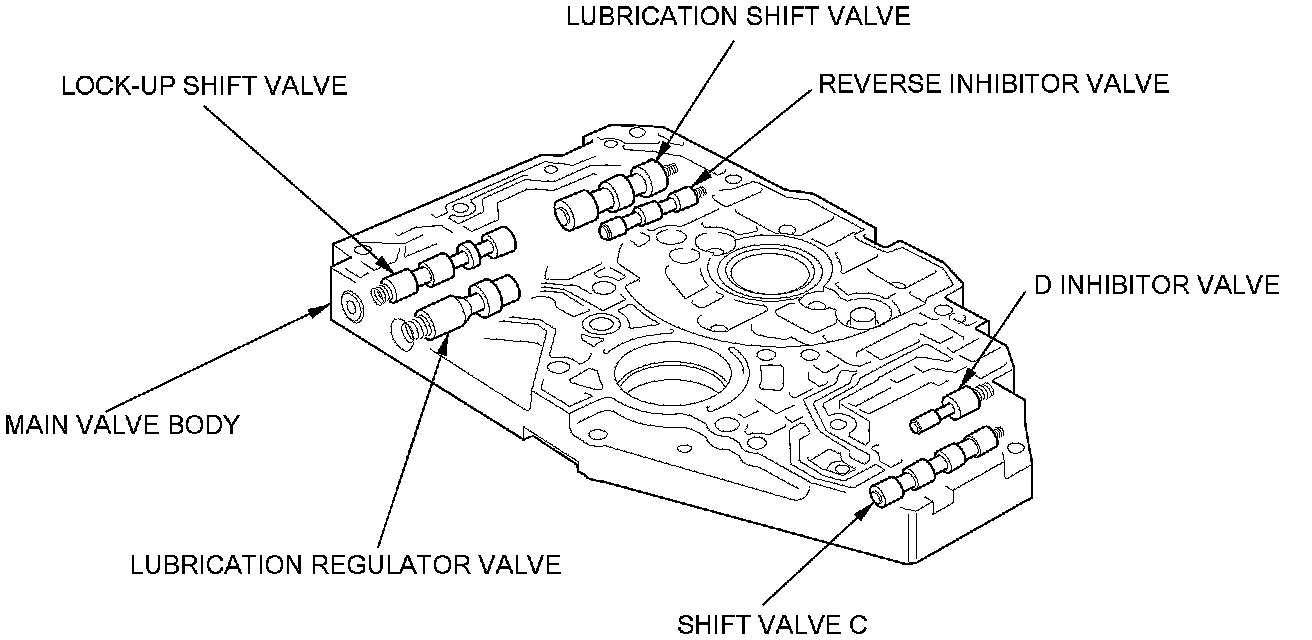 The main valve body contains shift valve C, the D inhibitor valve, the reverse inhibitor valve, the lock-up shift valve, the lubrication regulator valve, the lubrication shift valve, the ATF pump drive gear, and the ATF pump driven gear. The primary function of the main valve body is to switch fluid pressure on and off to control hydraulic pressure going to the hydraulic control system.