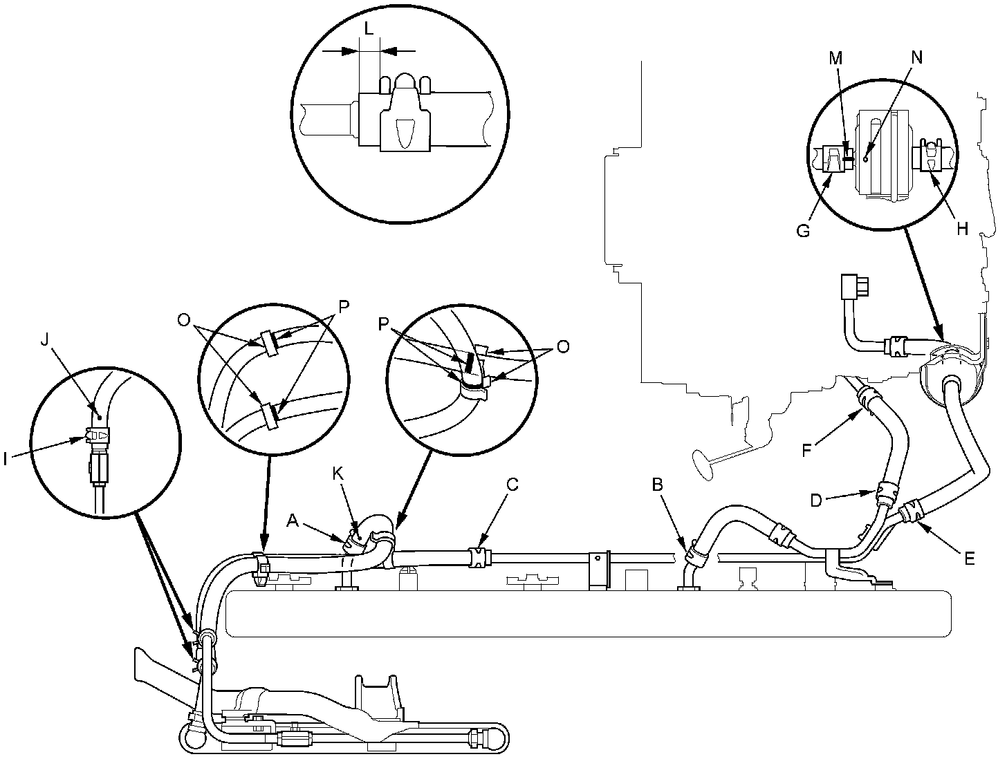 3. Secure the ATF cooler hose with the clamps (O) at the paint lines (P).
