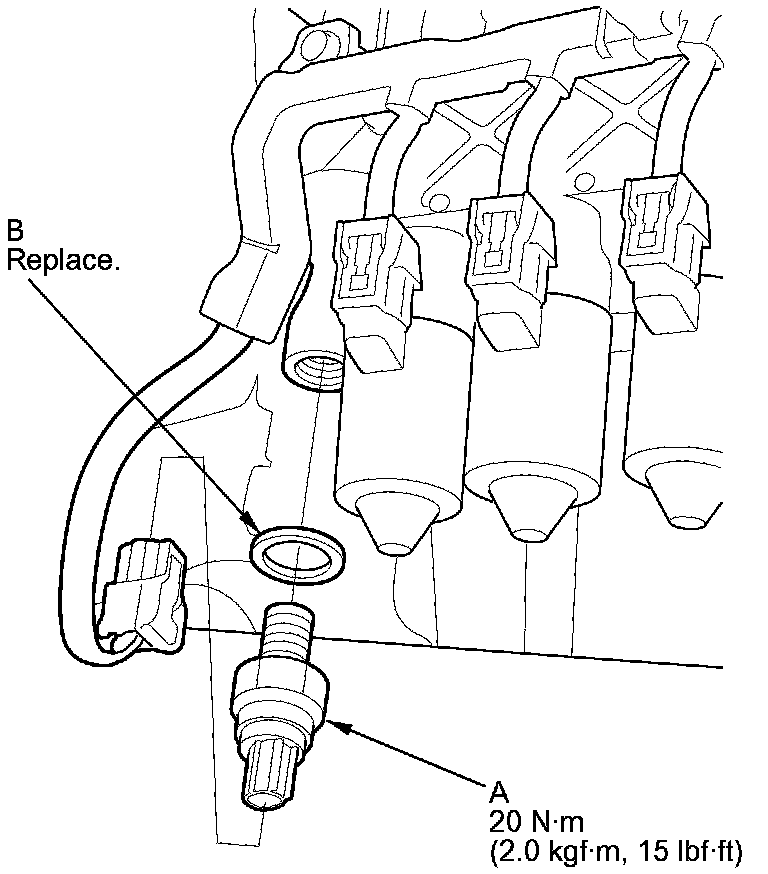 7. Disconnect the line pressure switch connector, and remove the line pressure switch (A) and the sealing washer (B).
